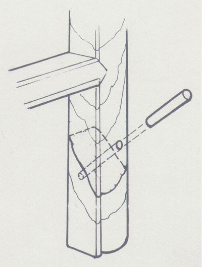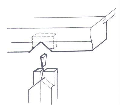 破頭楔(圖)通常是在透榫端部的靠近外側(cè)的適當位置,預先鋸開楔口,待榫入卯后,再備入楔子,使榫頭體積加大。此楔口也可以臨備楔前用鑿子刻開。常用在攢邊的桌面、椅面、床面的四角等結構部位的透榫上。