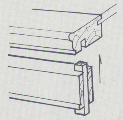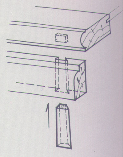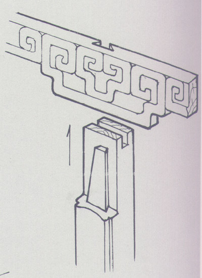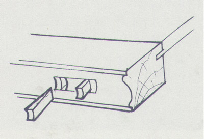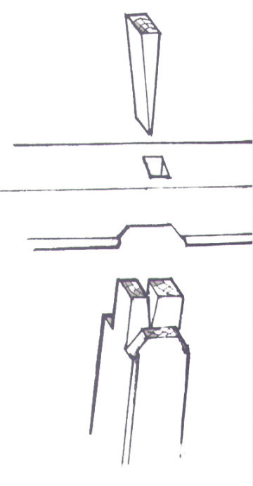 栽銷(圖)是在兩順向木材之間鑿眼垂直栽上的薄方木片,以聯(lián)結固定二者間的位置。如在桌面心板之間,床牙板與大邊之間等等。