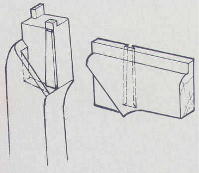 走馬銷(圖)“走馬”源于古建術語“走馬板”,是活動自由的意思。走馬銷是栽銷的一種,即在兩順材之間,用燕尾狀栽銷連接,其巧妙的結構,可使二都既緊密結合,又可拆卸自如,所以又名“仙人脫靴”。是羅漢床圍板、太師椅扶手上最常見的方便用銷。