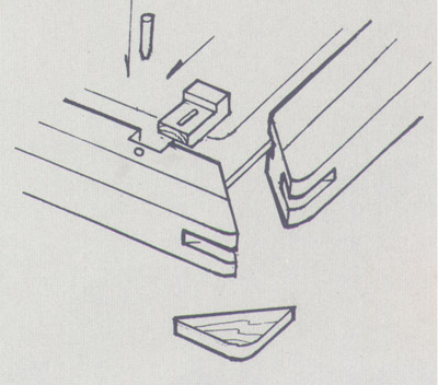 桌掛銷(圖)亦稱偏口掛銷。這種掛銷是明清硬木桌類家具腿部與牙板結合部必用的結構。其牢固程度高,不會丟失,配合“抱肓榫”,有較強的抗扭力。桌掛銷有定位準確、可反復拆裝、越打越嚴的特點,便于長途運輸,是蘇、廣及宮廷造辦處硬木桌子上必用的銷子。