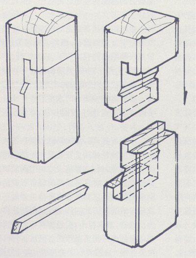 半榫破頭楔(圖)破頭楔用在半榫之內(nèi),易入難出。破頭楔一旦在半眼的卯里撐開后,榫頭將很難再退出,是一種沒有可逆性的獨特而堅固的結構,最適宜用在像抽屜桌桌面下的矮老等懸垂而負重的部件上。這種作法不常使用,因為它沒法修復,被稱為“絕戶活”。