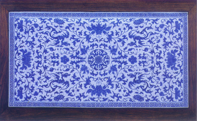 紅木炕桌上的青花鑲面、清、嘉慶(圖)鑲嵌是清式家具的主要裝飾手法之一,繼承前代業(yè)已成熟的技藝基礎之上,又在鑲嵌材料上有所擴展。同一時期的南方瓷業(yè)也相當發(fā)達,制瓷工藝領先于世界各國,象這樣大面積高溫瓷板不變形,而且釉色統(tǒng)一的桌面,在當時并不罕見。