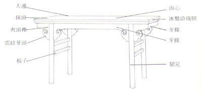 夾頭榫畫各部位名稱(圖)畫案的尺寸要大于半桌,與長條桌的區(qū)別就在于它的面較寬。畫梁與書案的區(qū)別在于前者不設抽屜而后者有抽屜。這種夾頭榫畫案是明式家具中畫案類的典型造型。