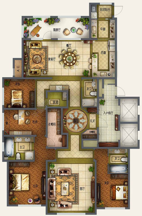 首先,功能分區。客廳、過廳、臥室、廚房、餐廳、衛生間、浴室、洗衣房、書房、電腦間、吧臺、花園、陽臺、健身房等。
